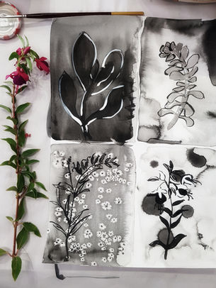 Après avoir appris les techniques de base de peinture à l'encre pour la création de fonds, nous avons créé deux feuilles de papier texturé sur lesquelles jouer plus tard dans l'après-midi. Je suis impressionné par la capacité de chacun à peindre des fleurs. Ce n'est pas une tâche facile, encore moins avec les 5 minutes impartie pour chaque étude!